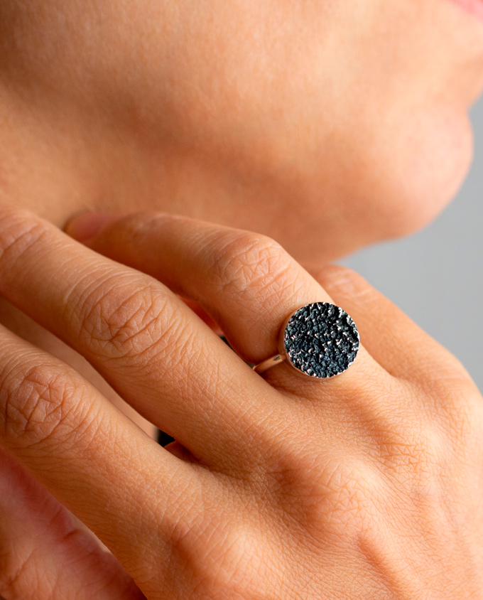 Cada pieza lleva impresa la textura de un menhir del sur de Cantabria. En Valdeolea, los menhires señalan coordenadas alineadas con las estrellas, este anillo es un lugar en su textura.