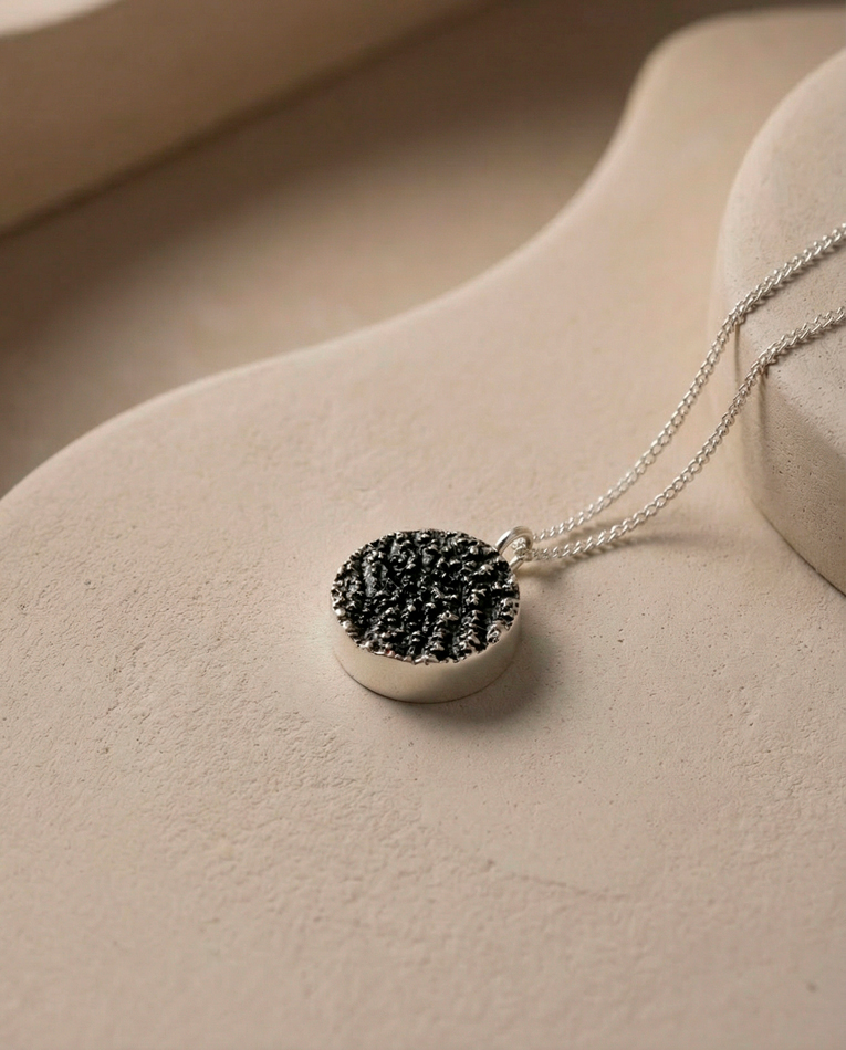 Cada pieza lleva impresa la textura de un menhir del sur de Cantabria. En Valdeolea, los menhires señalan coordenadas alineadas con las estrellas, este anillo posee lugares en su textura.